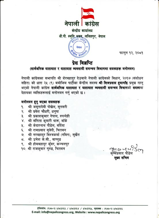 सभापति देउवाले नेपाली कांग्रेसको विधान, २०१७ (संशोधन सहित) को धारा २५ (९) बमोजिम पार्टीका केन्द्रीय सदस्य शिवप्रसाद हुमागाँइ प्रमुख रहनुभएको नेपाली कांग्रेस सार्वजनिक यातायात र यातायात व्यवसायी समन्वय विभागमा १० जना सदस्य मनोनयन गर्नुभएको पार्टीका मुख्य सचिव कृष्णप्रसाद पौडेलले जानकारी दिनुभएको छ ।