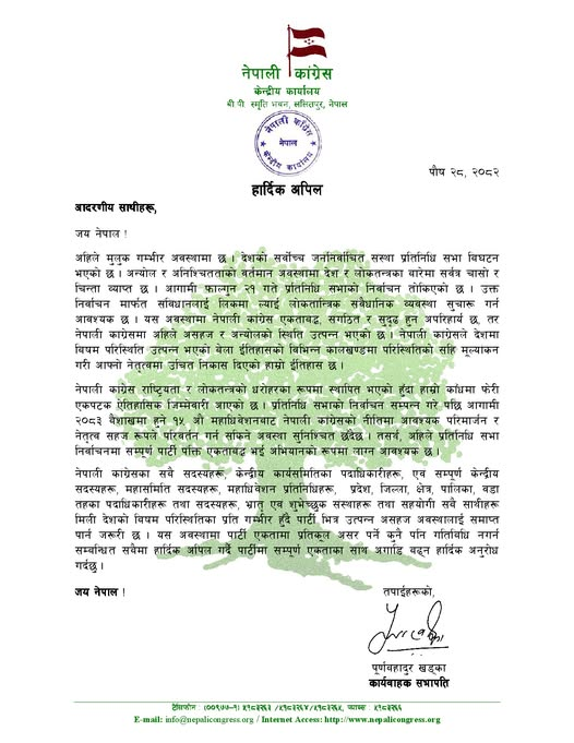 “कांग्रेस राष्ट्रियता र लोकतन्त्रको धरोहरका रूपमा स्थापित भएकाले हाम्रो काँधमा फेरी एकपटक ऐतिहासिक जिम्मेवारी आएको छ । प्रतिनिधिसभाको निर्वाचन सम्पन्न गएपछि विसं २०८३ वैशाखमा हुने १५औँ महाधिवेशनबाट पार्टीको नीतिमा आवश्यक परिमार्जन गरी नेतृत्व सहज रूपले परिवर्तन गर्न सक्ने अवस्था सुनिश्चित छ । तसर्थ, अहिले प्रतिनिधिसभा निर्वाचनमा सम्पूर्ण पार्टीपङ्क्ति एकताबद्ध भई अभियानका रूपमा लाग्न आवश्यक छ”, उहाँले विज्ञप्तिमा उल्लेख गर्नुभएको छ ।