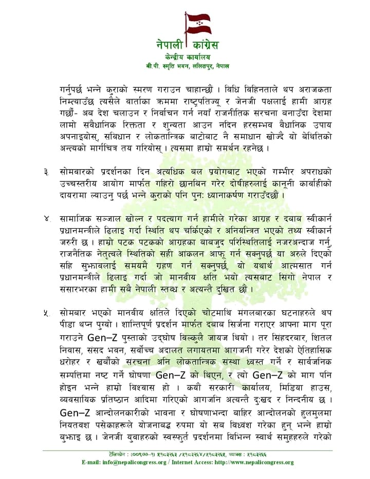 “सामाजिक सञ्जाल खोल्न र पदत्याग गर्न हामीले गरेका आग्रह र दबाब स्वीकार्न प्रधानमन्त्रीले ढिलाइ गर्दा स्थिति थप चर्किएको र अनियन्त्रित भएको तथ्य स्वीकार्न जरुरी छ”, महामन्त्रीद्वयले उल्लेख गर्नुभएको छ, “हाम्रो पटकपटकको आग्रहका बाबजुद परिस्थितिलाई नजरअन्दाज गर्नु, राजनीतिक नेतृत्वले स्थितिको सही आँकलन आफू गर्न सक्नुपर्छ या अरुले दिएको सही सुझावलाई समयमै ग्रहण गर्न सक्नुपर्छ, यो यथार्थ आत्मसात् गर्न प्रधानमन्त्रीले ढिलाइ गर्दा जो मानवीय क्षति भयो त्यसबाट सिङ्गो मुलुक र संसारभरका सबै नेपाली स्तब्ध र अत्यन्तै दुखित छौँ ।”