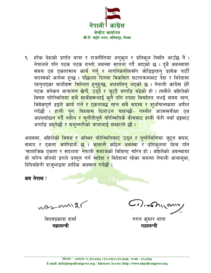 अब फेरिएको यस परिस्थितिमा युवाको आकाङ्क्षा र अपेक्षाअनुसार जिम्मेवार राजनीति गर्ने दलका रुपमा कांग्रेसलाई जरैदेखि सम्पूर्ण रुपमा पुनर्निर्माण गर्ने प्रतिबद्धता जनाउनुभएको छ ।